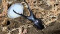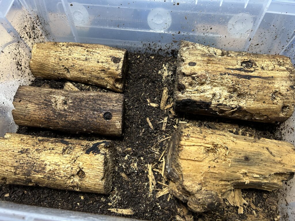 産卵木はナラ材を使用。肉質が良く爪を立てて表面がぴきぴき割れる程度の材を使用した。樹皮を剝いだ後、30分ほど加水して、そのまま使用、または材が硬い場合は幼虫に使用したマットに埋めてバクテリア材に加工して使用。マットを2~3 cm ほど敷き詰めて、その上に材を転がす。マットは基本的に材から卵や幼虫が落ちた時にその個体が生存できるようにすることが目的なので、幼虫が生育できる種類なら何でも大丈夫だが、幼虫がより大きく育つように我が家では幼虫飼育に使用しているマットを使用している。材は1セットで10本前後は使用して、1回のセットで5~6本使用する。材の表面産みなので、細い材よりは太めの材を使用して表面積をかせいだ方がよい。我が家では材の表面のみ加水した材 (内部が乾燥した状態) で産卵セットを組んだ場合、高確率で卵が変色したりしぼんだりして孵化率が低下している。逆に材の内部までしっかりと加水している材 (雨が降った後のようなかなり湿った状態) では孵化率が高いため多湿な環境が適している可能性がある。画像の右下の材は水分量が丁度よく反応も良い。